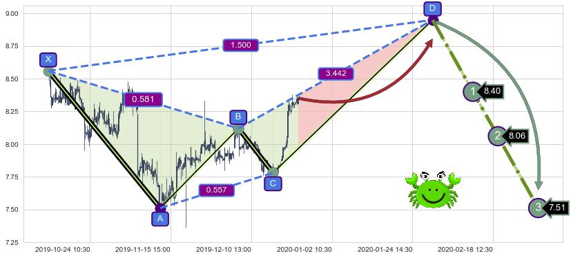 ➢ 距离预测D点位置有足够的上涨空间, 与看跌【螃蟹】形态相反,实际方向【看涨】