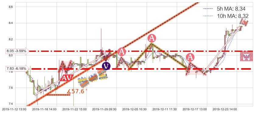 ♘ 支撑价格位7.83,可信任强度92.35%,距离最后交易2019-12-24 11:30形成的收盘价格8.35相差 -6.18%