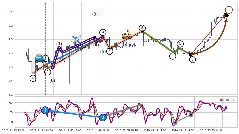 从2019-12-12 14:00至2019-12-24 11:30,共包含47个小时,阶段股价上涨6.87%,阶段股价变动位移路程比: 1 : 2.0