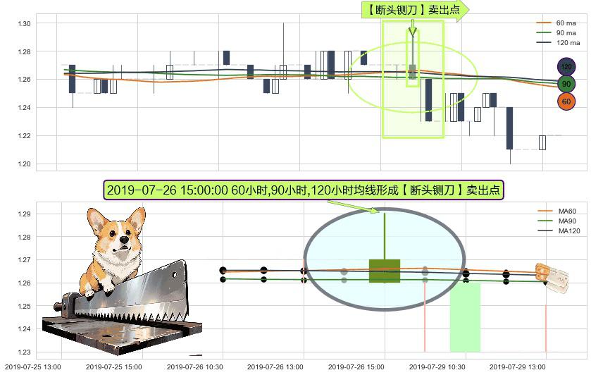 形态多维评估: ⚀ 2019-07-26 15:00:00小时显现 60小时-90小时-120小时均线 【断头铡刀】卖出点 看空信号,后市看跌,卖出
