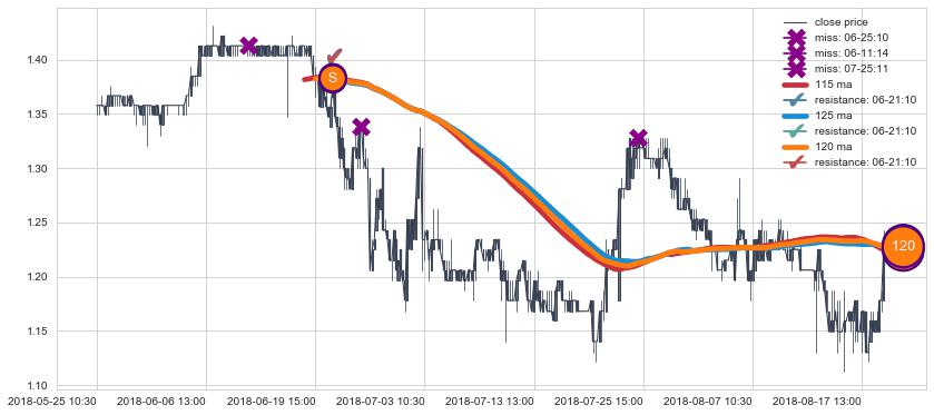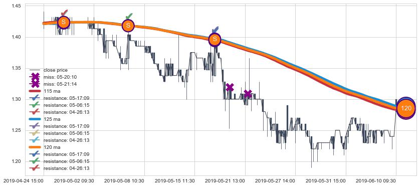 下跌趋势04-24 15:00-06-10 10:30,均线120, 115, 125确认关键阻力3处