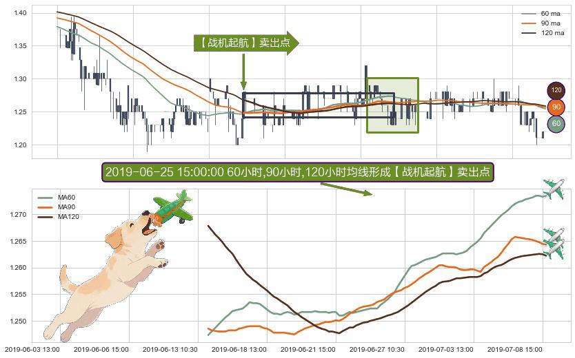 形态多维评估: ⚀ 2019-06-13 14:00:00小时-2019-07-09 09:30:00小时显现 60小时-90小时-120小时均线 【战机起航】卖出点 看空信号,后市看跌,卖出