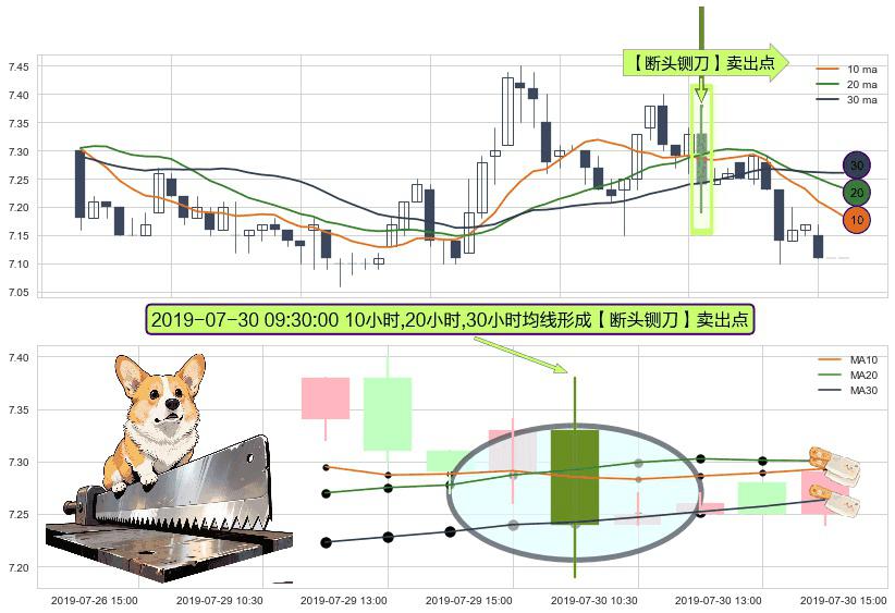 ⚀ 2019-07-30 09:30:00小时显现 10小时-20小时-30小时均线 【断头铡刀】卖出点 看空信号,后市看跌,卖出