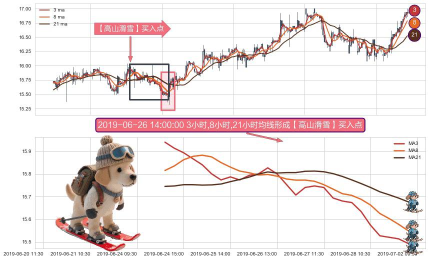 形态多维评估: ⚀ 2019-06-24 13:00:00小时-2019-06-28 15:00:00小时显现 3小时-8小时-21小时均线 【高山滑雪】买入点 看多信号,后市看涨,买入
