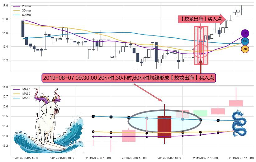 形态多维评估: ⚀ 2019-08-07 09:30:00小时显现 20小时-30小时-60小时均线 【蛟龙出海】买入点 看多信号,后市看涨,买入