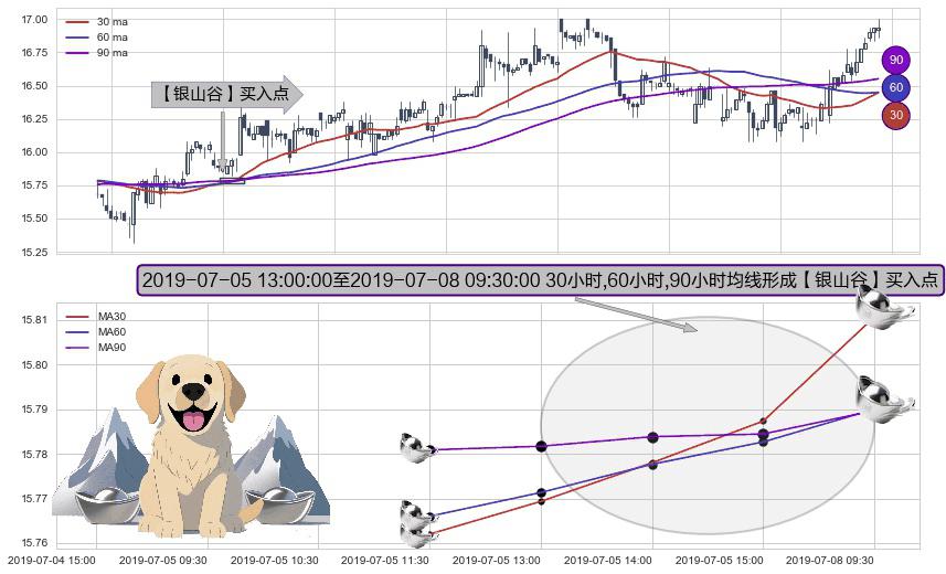 形态多维评估: ⚀ 2019-07-05 14:00:00-小时至2019-07-08 09:30:00-小时显现 30小时-60小时-90小时均线 【银山谷】买入点 看多信号,后市看涨,买入