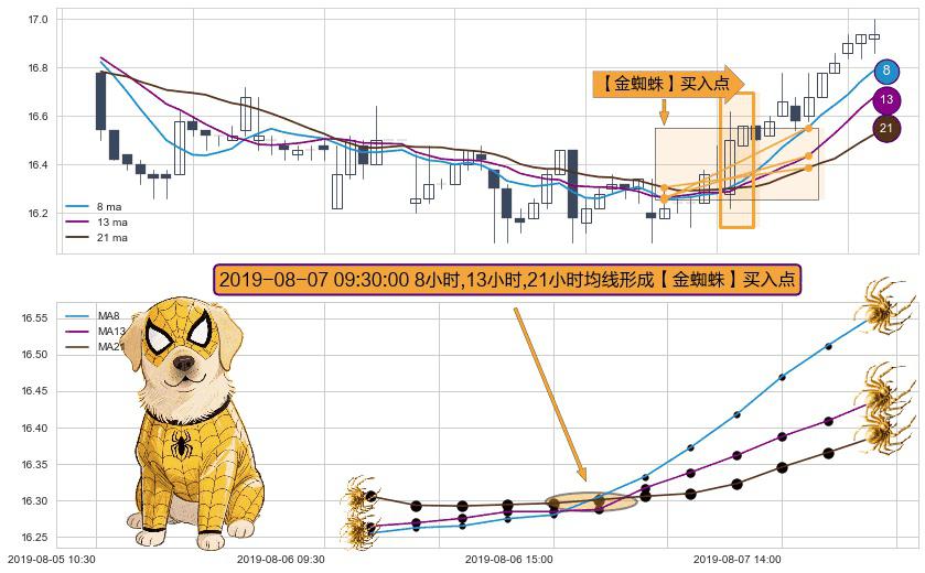 形态多维评估: ⚀ 2019-08-07 09:30:00小时显现 8小时-13小时-21小时均线 【金蜘蛛】买入点 看多信号,后市看涨,买入