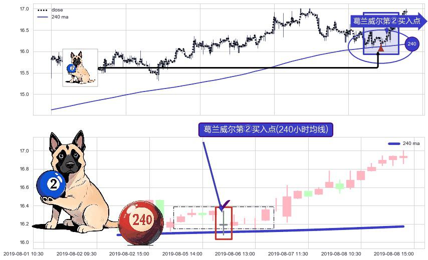 形态多维评估: ⚀ 2019-08-06 09:30:00-小时显现 葛兰威尔均线 240小时均线 第②买入点 上升趋势的中继信号,后市看涨,买进信号