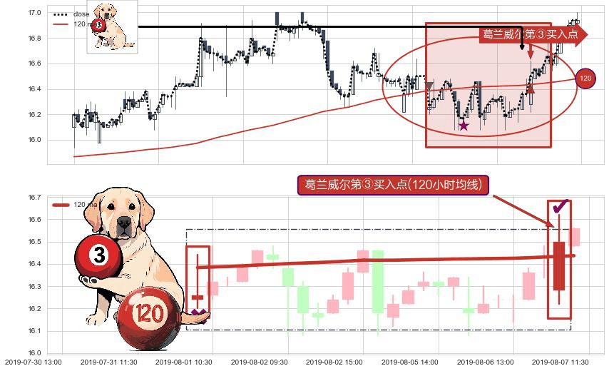 形态多维评估: ⚀ 2019-08-07 09:30:00-小时显现 葛兰威尔均线 120小时均线 第③买入点 上升趋势的中继信号,后市看涨,买进信号