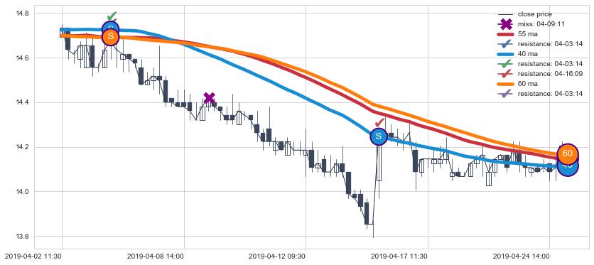 下跌趋势04-02 11:30-04-25 09:30,均线40, 60, 55确认关键阻力2处