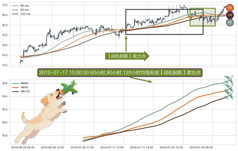 形态多维评估: ⚀ 2019-07-03 15:00:00小时-2019-07-31 15:00:00小时显现 60小时-90小时-120小时均线 【战机起航】卖出点 看空信号,后市看跌,卖出