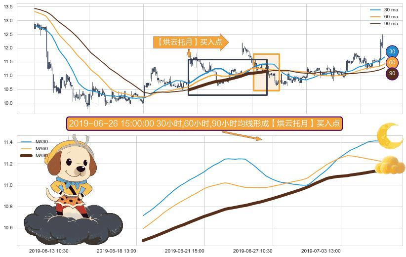 形态多维评估: ⚀ 2019-06-18 15:00:00小时-2019-07-05 14:00:00小时显现 30小时-60小时-90小时均线 【烘云托月】买入点 看多信号,后市看涨,买入