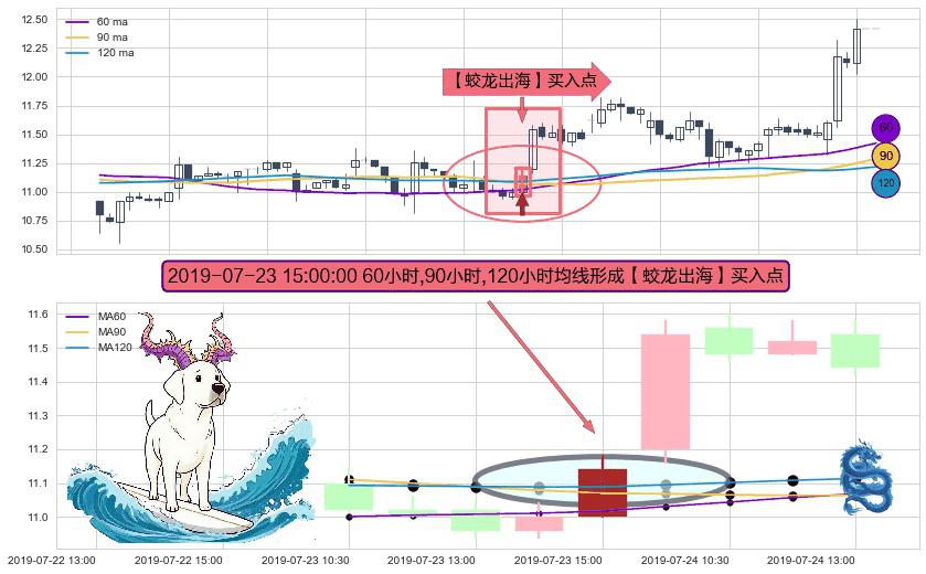 形态多维评估: ⚀ 2019-07-23 15:00:00小时显现 60小时-90小时-120小时均线 【蛟龙出海】买入点 看多信号,后市看涨,买入