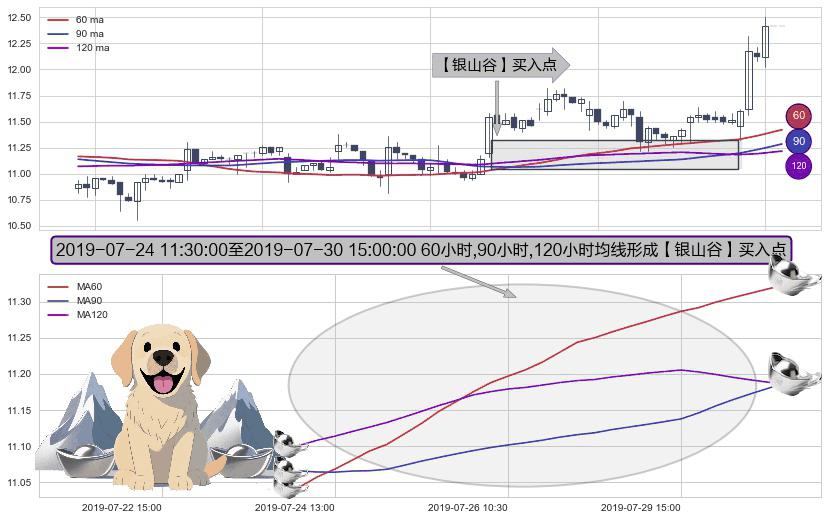 形态多维评估: ⚀ 2019-07-24 13:00:00-小时至2019-07-30 15:00:00-小时显现 60小时-90小时-120小时均线 【银山谷】买入点 看多信号,后市看涨,买入