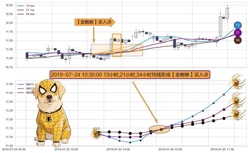 形态多维评估: ⚀ 2019-07-24 10:30:00小时显现 13小时-21小时-34小时均线 【金蜘蛛】买入点 看多信号,后市看涨,买入