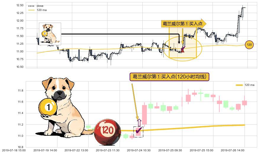 形态多维评估: ⚀ 2019-07-23 15:00:00-小时显现 葛兰威尔均线 120小时均线 第买①入点 走势反转见底信号,后市看涨,买进信号