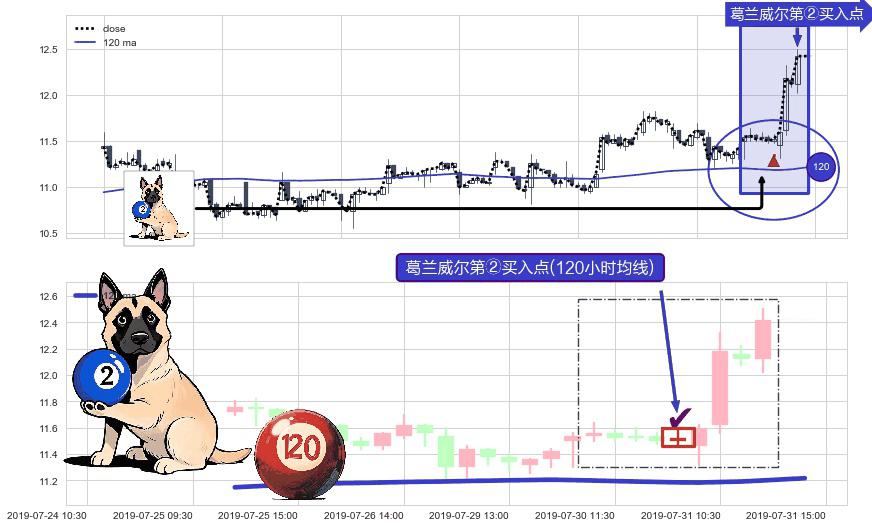 形态多维评估: ⚀ 2019-07-30 15:00:00-小时显现 葛兰威尔均线 120小时均线 第②买入点 上升趋势的中继信号,后市看涨,买进信号