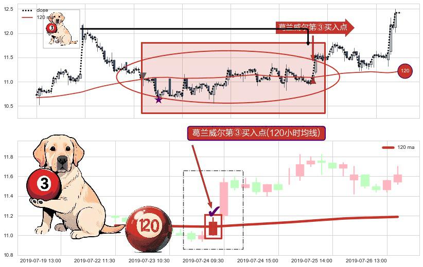 形态多维评估: ⚀ 2019-07-23 15:00:00-小时显现 葛兰威尔均线 120小时均线 第③买入点 上升趋势的中继信号,后市看涨,买进信号