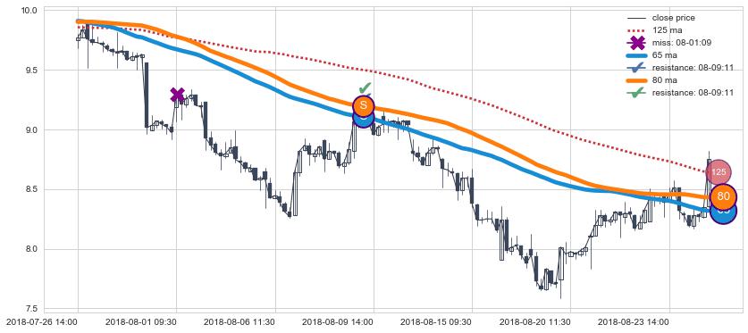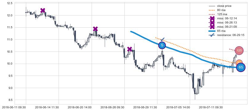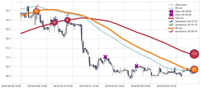 下跌趋势05-06 10:30-06-06 09:30,均线80, 125确认关键阻力3处