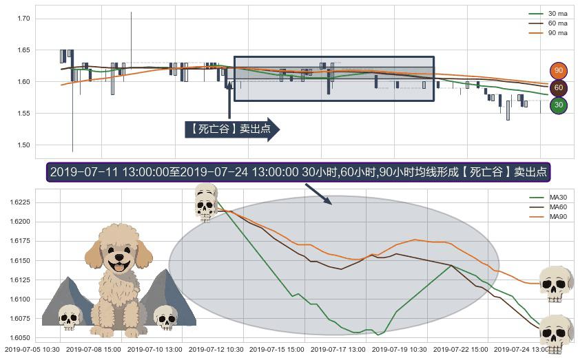 形态多维评估: ⚀ 2019-07-11 14:00:00-小时至2019-07-24 13:00:00-小时显现 30小时-60小时-90小时均线 【死亡谷】卖出点 看空信号,后市看跌,卖出