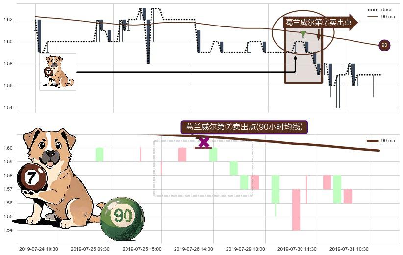 形态多维评估: ⚀ 2019-07-26 13:00:00-小时显现 葛兰威尔均线 90小时均线 第⑦卖出点 下降趋势的中继信号,后市看跌,卖出信号