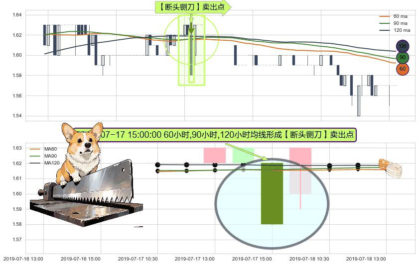 形态多维评估: ⚀ 2019-07-17 15:00:00小时显现 60小时-90小时-120小时均线 【断头铡刀】卖出点 看空信号,后市看跌,卖出