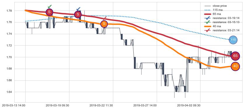 下跌趋势03-13 14:00-04-04 11:30,均线40, 65确认关键阻力3处