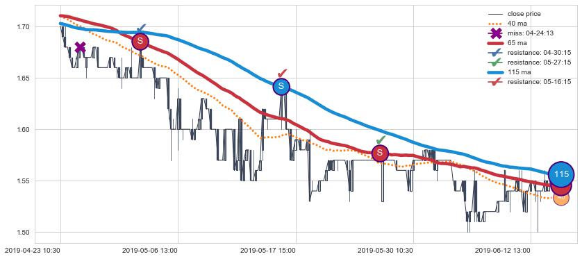 下跌趋势04-23 10:30-06-14 09:30,均线65, 115确认关键阻力3处