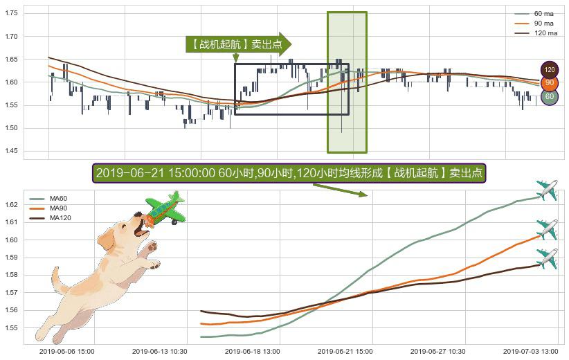 形态多维评估: ⚀ 2019-06-13 14:00:00小时-2019-07-02 15:00:00小时显现 60小时-90小时-120小时均线 【战机起航】卖出点 看空信号,后市看跌,卖出