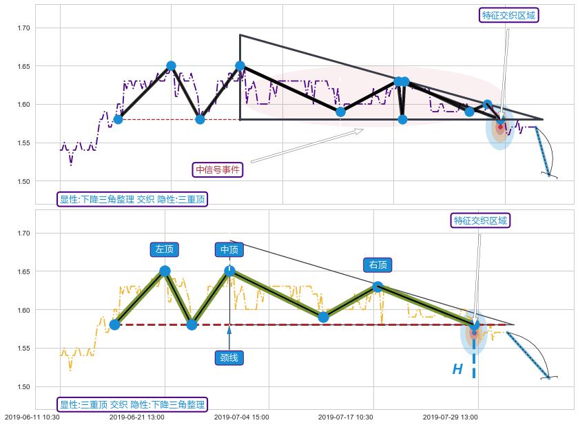 ➣ 【已确认突破】下降三角形整理 起点:06-28:14,突破点:07-29:10,形态共118交易小时