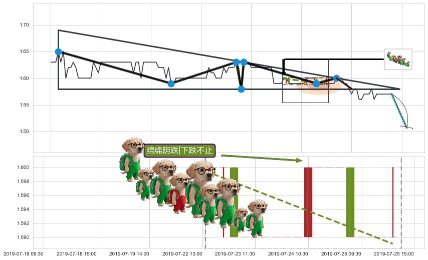 从2019-07-23 14:00至2019-07-31 15:00,共包含38个小时,阶段股价下跌-1.23%,阶段股价变动位移路程比: 1 : 7