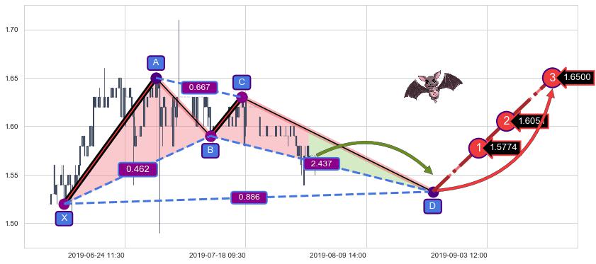 ➢ 距离预测D点位置尚有下跌空间,短线依然【看跌】, 耐心等待看涨【蝙蝠】形态反转启动
