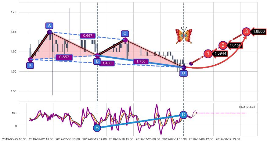 ➣ 已完成【蝴蝶】形态起点X: 06-25:14, 终点D: 07-30:14, 共145交易小时
