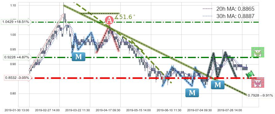 ⚔️ 2019-03-04 10:30-2019-07-04 09:30下跌趋势存在反转上涨[机会],其原下跌趋势的阻力位(0.7928)已被突破[强支撑信号],原下跌趋势角度: 51.6˚