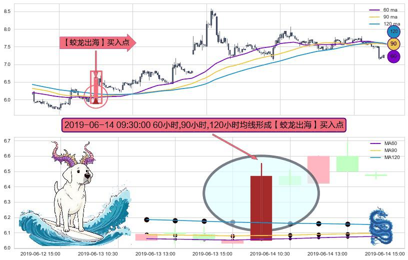 形态多维评估: ⚀ 2019-06-14 09:30:00小时显现 60小时-90小时-120小时均线 【蛟龙出海】买入点 看多信号,后市看涨,买入