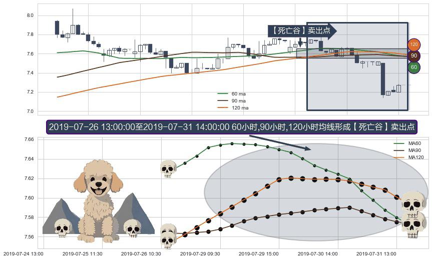 形态多维评估: ⚀ 2019-07-26 14:00:00-小时至2019-07-31 14:00:00-小时显现 60小时-90小时-120小时均线 【死亡谷】卖出点 看空信号,后市看跌,卖出