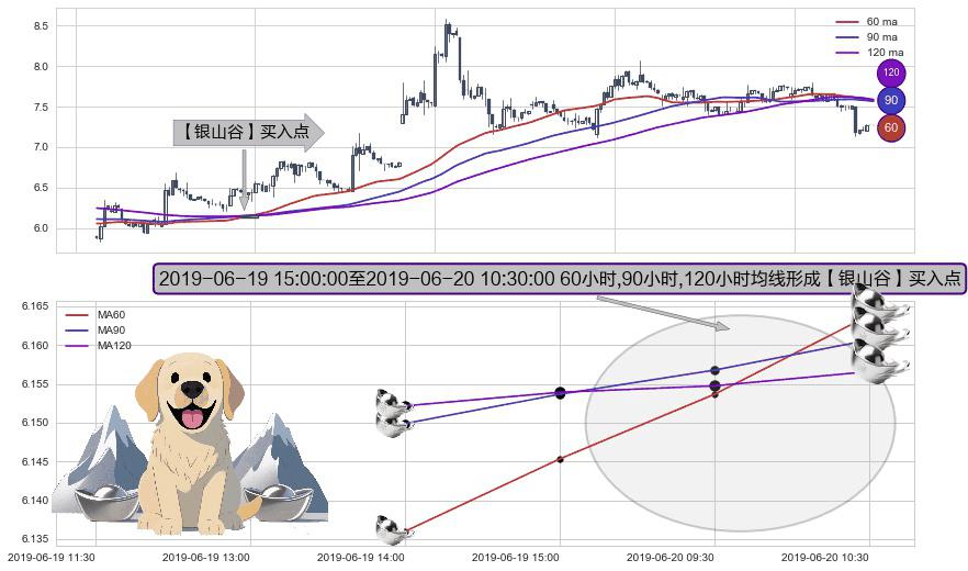 形态多维评估: ⚀ 2019-06-20 09:30:00-小时至2019-06-20 10:30:00-小时显现 60小时-90小时-120小时均线 【银山谷】买入点 看多信号,后市看涨,买入