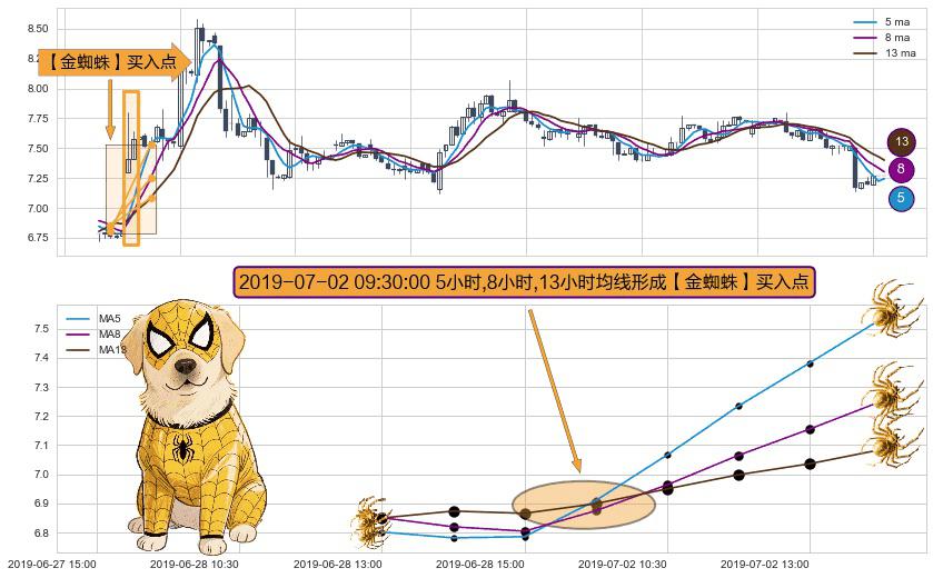 形态多维评估: ⚀ 2019-07-02 09:30:00小时显现 5小时-8小时-13小时均线 【金蜘蛛】买入点 看多信号,后市看涨,买入