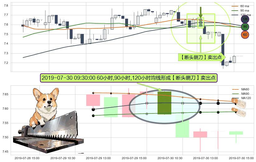 形态多维评估: ⚀ 2019-07-30 09:30:00小时显现 60小时-90小时-120小时均线 【断头铡刀】卖出点 看空信号,后市看跌,卖出