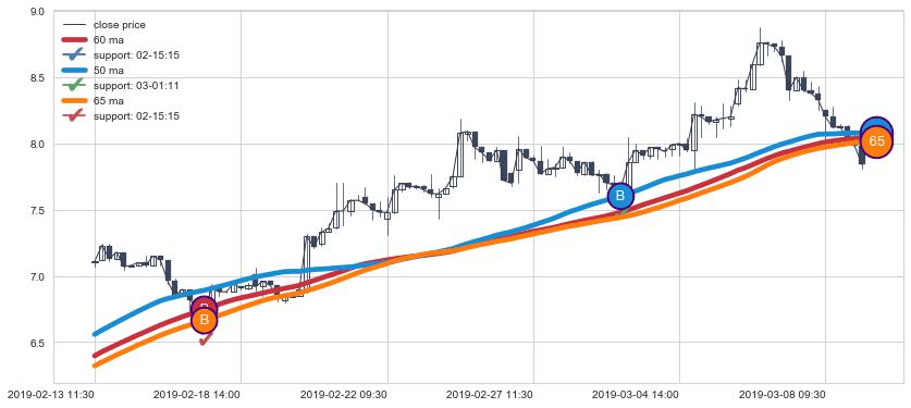 上涨趋势02-13 11:30-03-08 15:00,均线65, 50, 60确认关键支撑2处
