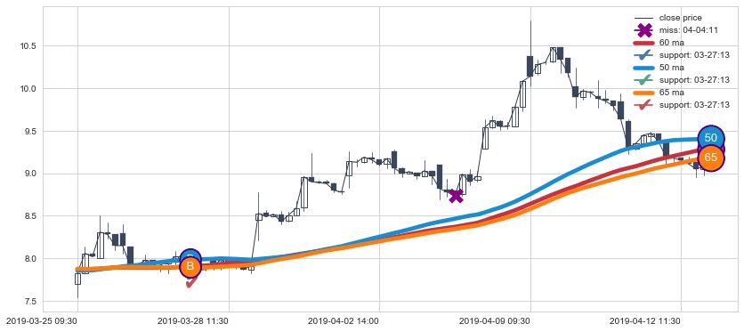 上涨趋势06-13 15:00-07-11 15:00,均线65, 50, 60确认关键支撑3处