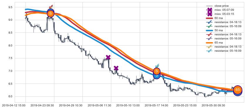 下跌趋势04-12 15:00-05-31 10:30,均线65, 50, 60确认关键阻力2处