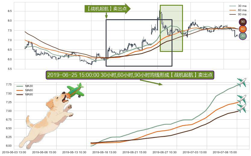 形态多维评估: ⚀ 2019-06-13 14:00:00小时-2019-07-09 09:30:00小时显现 30小时-60小时-90小时均线 【战机起航】卖出点 看空信号,后市看跌,卖出