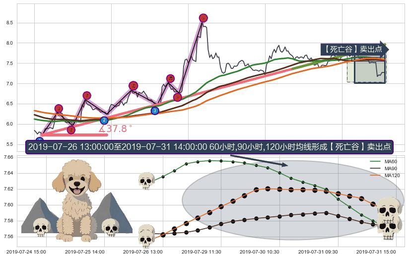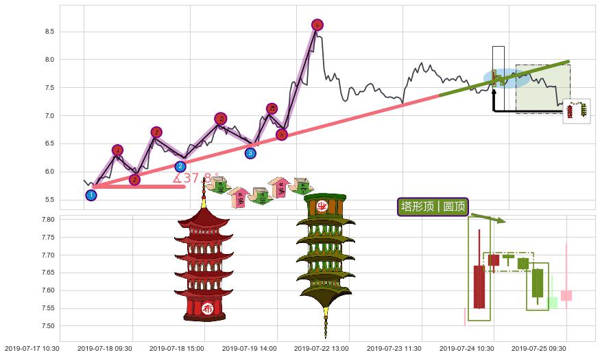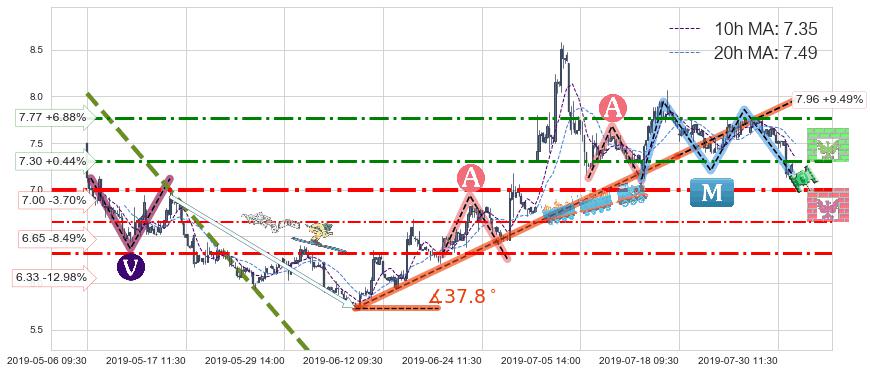 ➣ 2019-06-06 14:00-2019-07-17 15:00上升趋势存在反转[风险],其原上升趋势的支撑位(7.96)已破位[强阻力信号],原上升趋势角度: 37.8˚