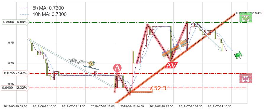 ♘ 阻力价格位0.8000,可信任强度55.27%,距离最后交易2019-07-31 15:00形成的收盘价格0.7300相差 +9.59%