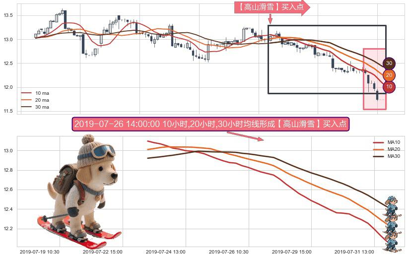 ⚀ 2019-07-23 13:00:00小时-2019-07-31 15:00:00小时显现 10小时-20小时-30小时均线 【高山滑雪】买入点 看多信号,后市看涨,买入