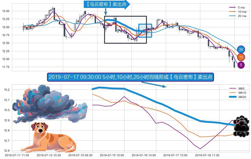 ⚀ 2019-07-15 09:30:00小时-2019-07-18 15:00:00小时显现 5小时-10小时-20小时均线 【乌云密布】卖出点 看空信号,后市看跌,卖出