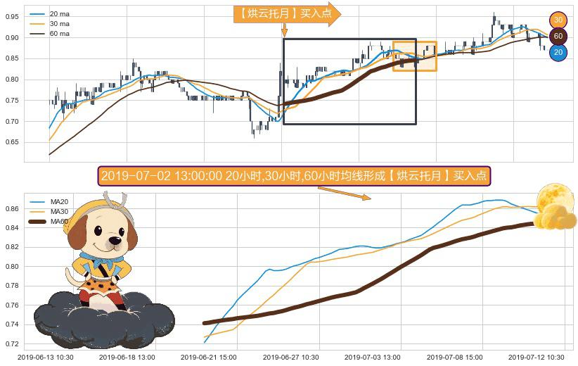 形态多维评估: ⚀ 2019-06-20 13:00:00小时-2019-07-11 13:00:00小时显现 20小时-30小时-60小时均线 【烘云托月】买入点 看多信号,后市看涨,买入