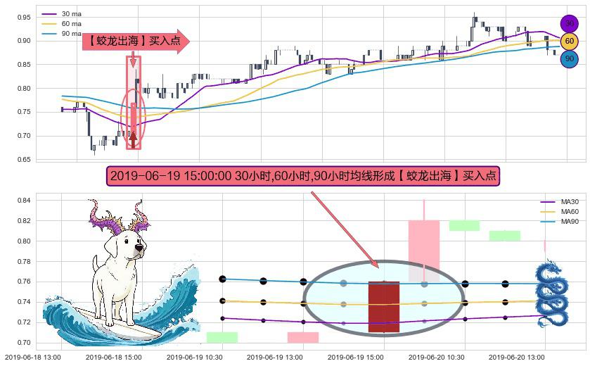 形态多维评估: ⚀ 2019-06-19 15:00:00小时显现 30小时-60小时-90小时均线 【蛟龙出海】买入点 看多信号,后市看涨,买入