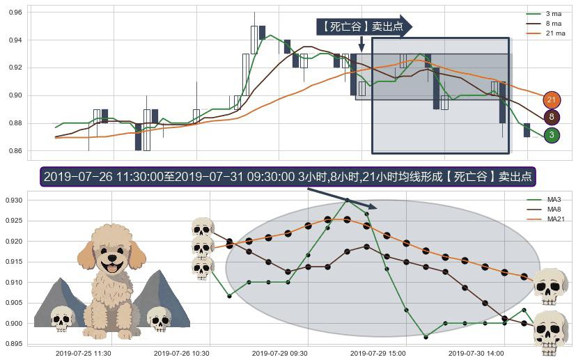 形态多维评估: ⚀ 2019-07-26 13:00:00-小时至2019-07-31 09:30:00-小时显现 3小时-8小时-21小时均线 【死亡谷】卖出点 看空信号,后市看跌,卖出
